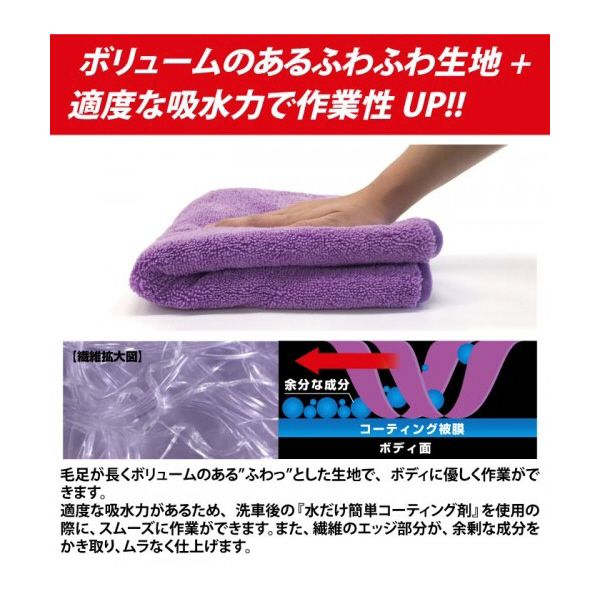 適度な吸水力があるため、洗車後の『水だけ簡単コーティング剤』を使用の際に、スムーズに作業ができます。