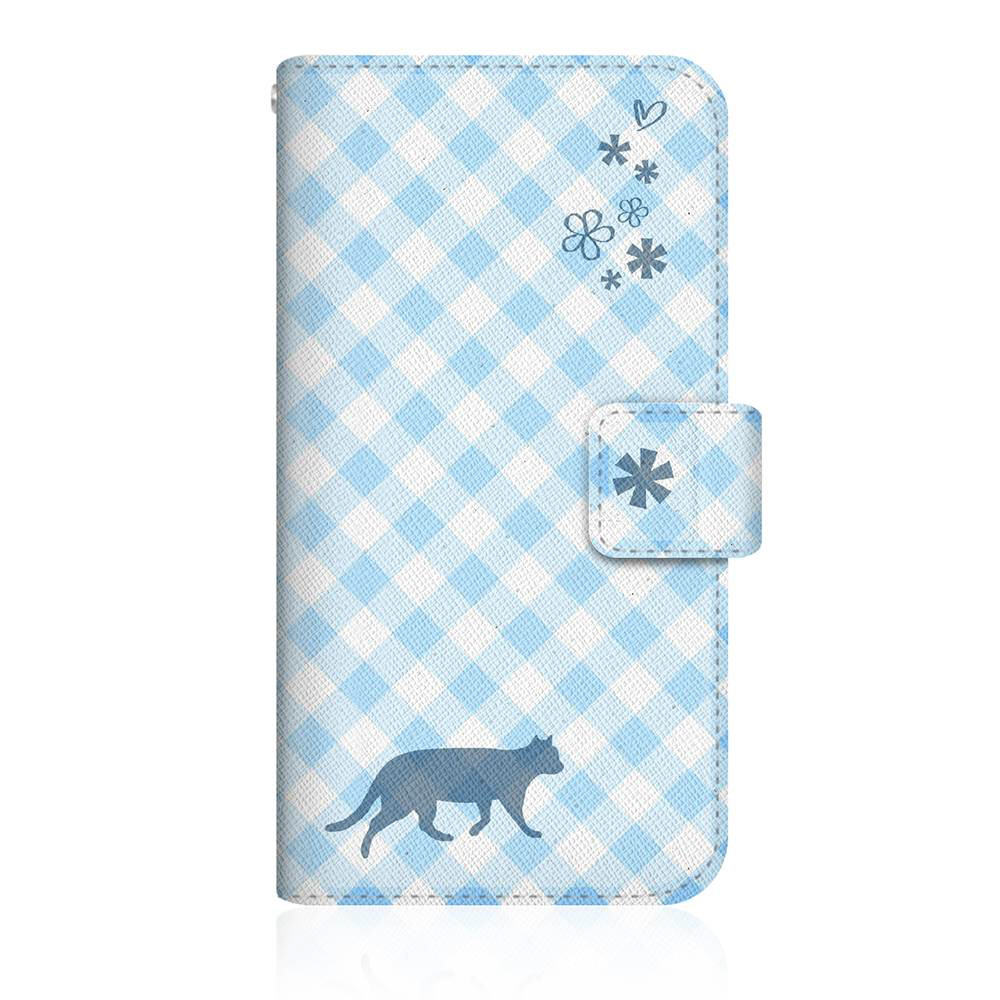 NYAGO G020D スリム手帳型ケース NYAGO ノート サマー フラワー ダイアリー キャット シルエット - ブルー チェッククロス柄 & てくてくお散歩 G020D-BNG2S2675-78