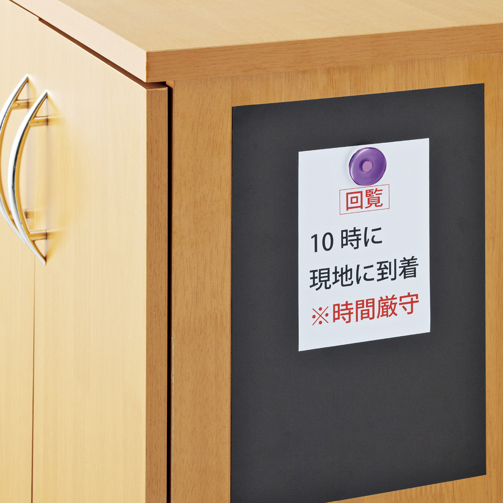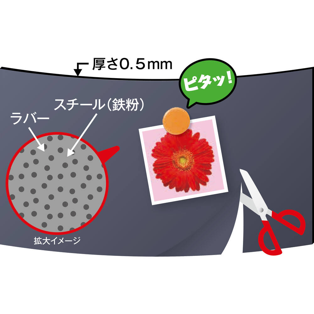 スチール(鉄粉)を含んだラバーシートで、ポスターなどをマグネット(別売)で掲示することができます。