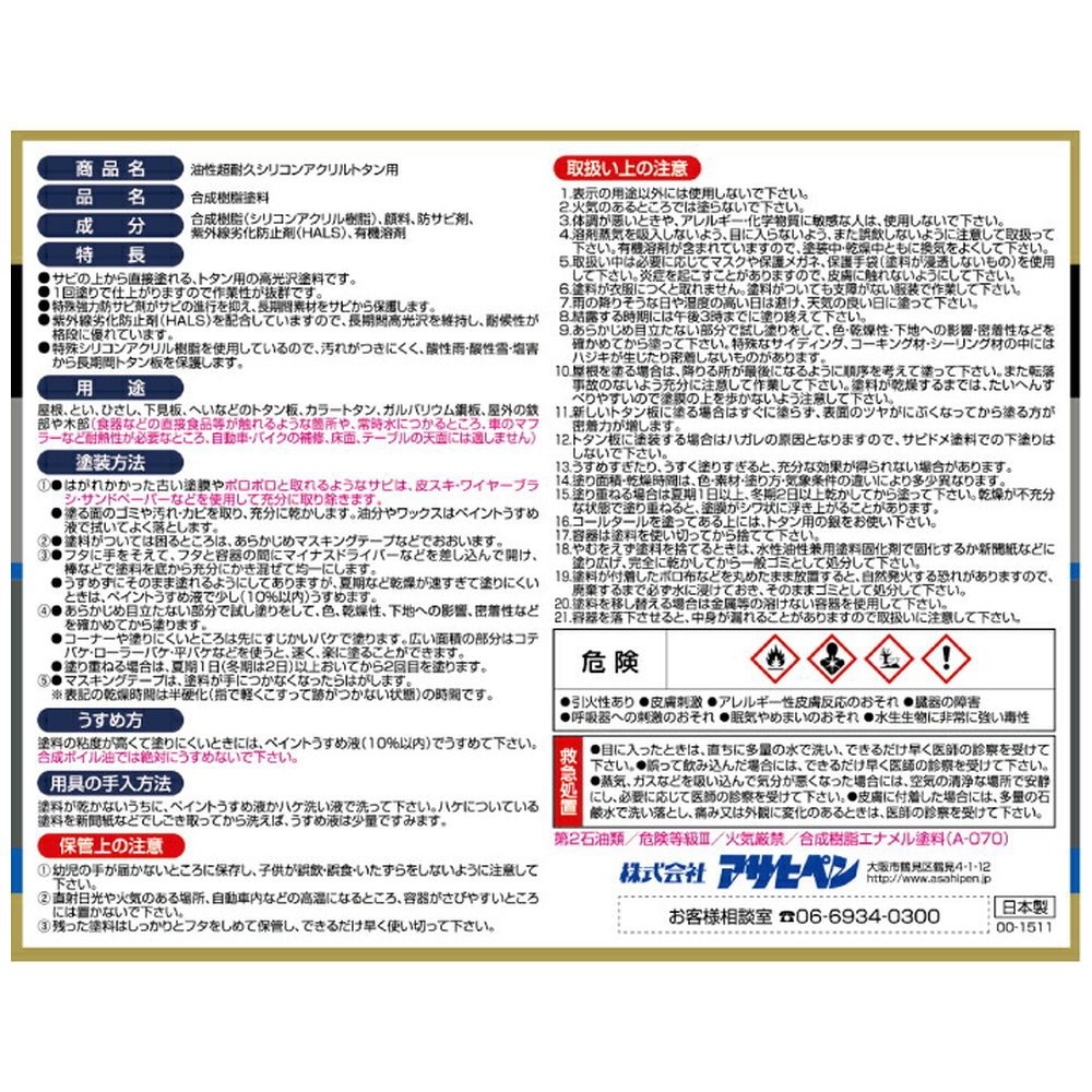 ●特殊シリコンアクリル樹脂を使用しているので、汚れがつきにくく、酸性雨・酸性雪・塩害から長期間トタン板を保護します。