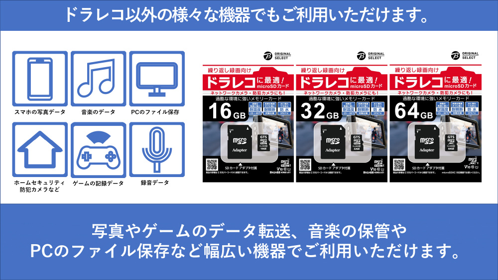 ドライブレコーダーやネットワークカメラ・防犯カメラ等、繰り返し録画する機器向けに作られており、安心して使用できます。