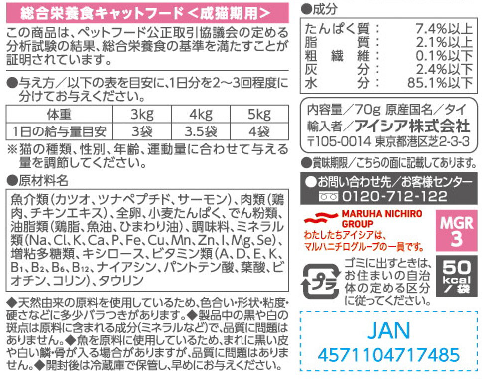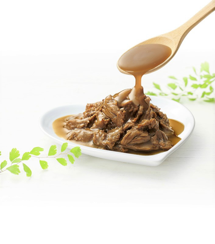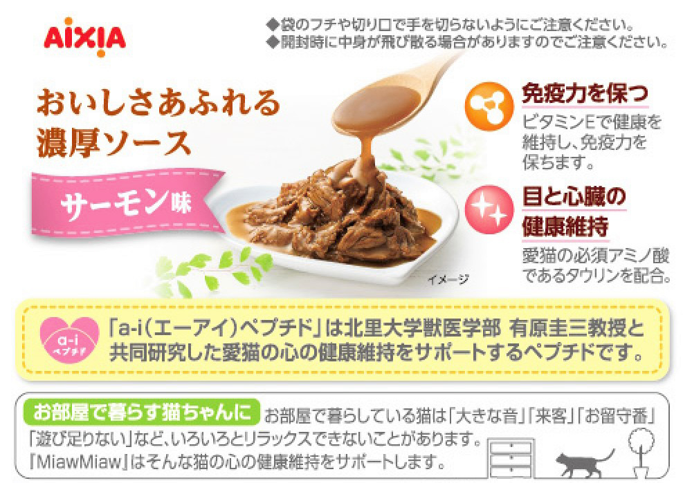 お魚とお肉のおいしさが詰まった素材を濃厚なグレービーソースでからめた総合栄養食。お部屋で暮らす愛猫の心の健康維持に配慮して「a-iペプチド」を配合。