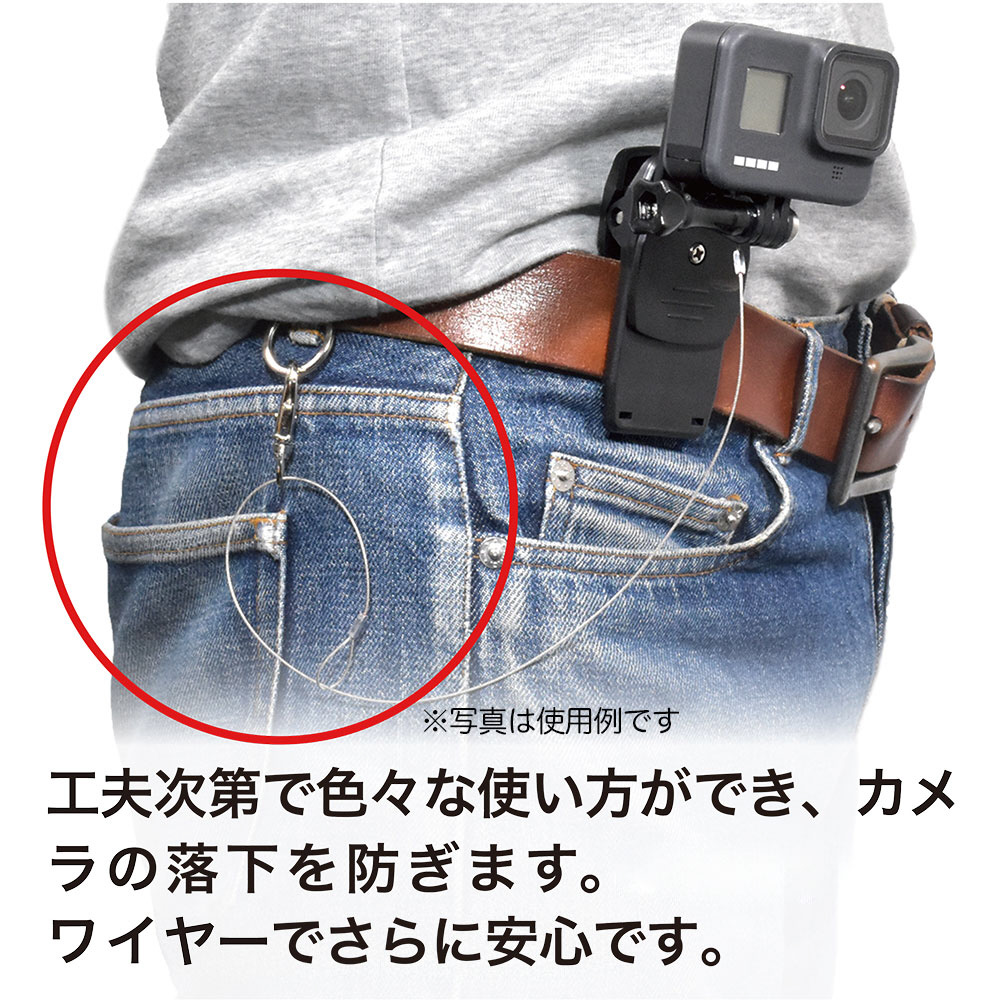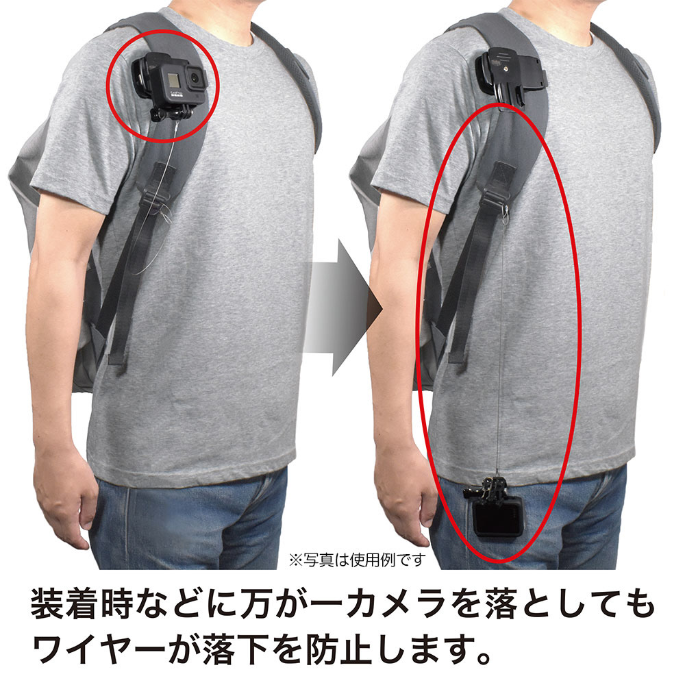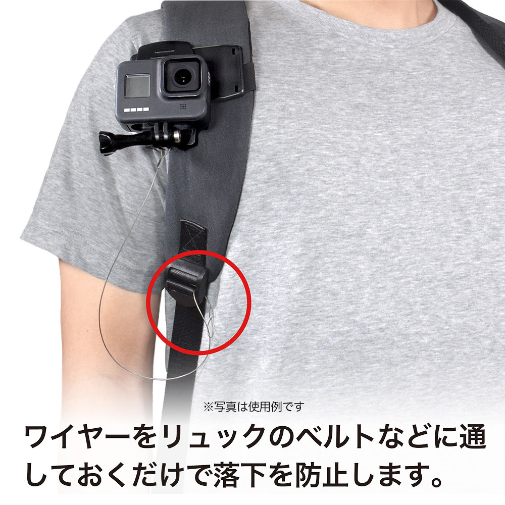 落下防止対策セットも付属しますので、例えばワイヤーの一方をリュックベルトの金具に固定し、もう一方をバックルに通しておくだけで落下防止となります。