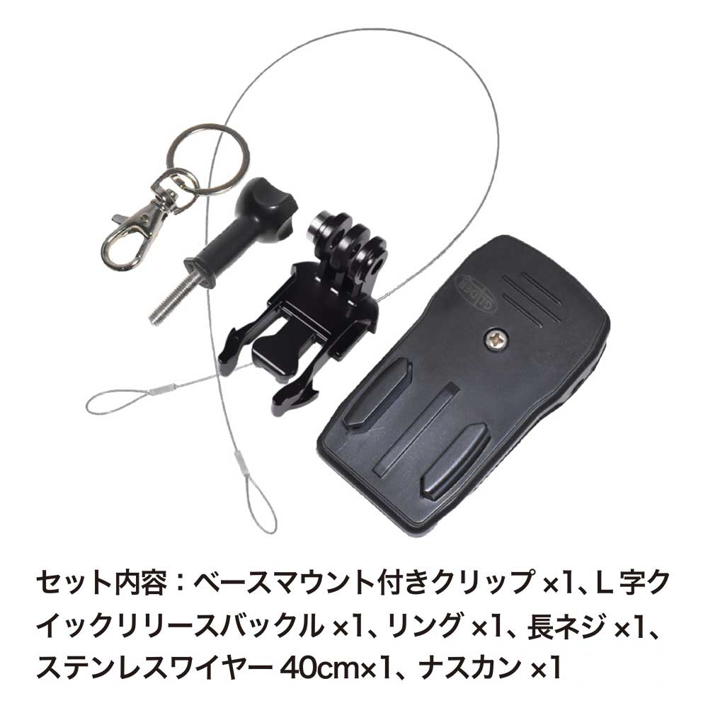 ●セット内容:クリップマウント x1、L字クイックリリースバックル x1、ステンレスワイヤー40cm(両端ループ) x1、Aネジ x1、リング x1、ナスカン x1