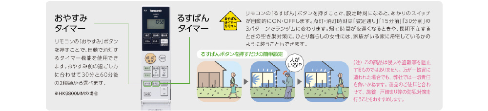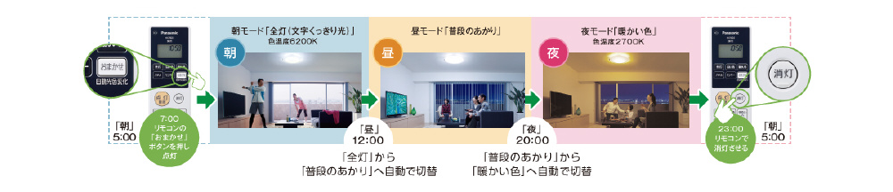 リモコン【パネル(2・1枚切替可能)・センター・おまかせ・全灯・普段・白い色・暖かい色・常夜灯〈6段調光可能〉・滅】 リモコン送信器使用時のみ〈100%〜約5%〉調光・〈昼光色〜電球色〉調色可能・常夜灯(6段調光可能)↓↓壁スイッチ【普段→常夜灯】おやすみタイマー るすばんタイマー