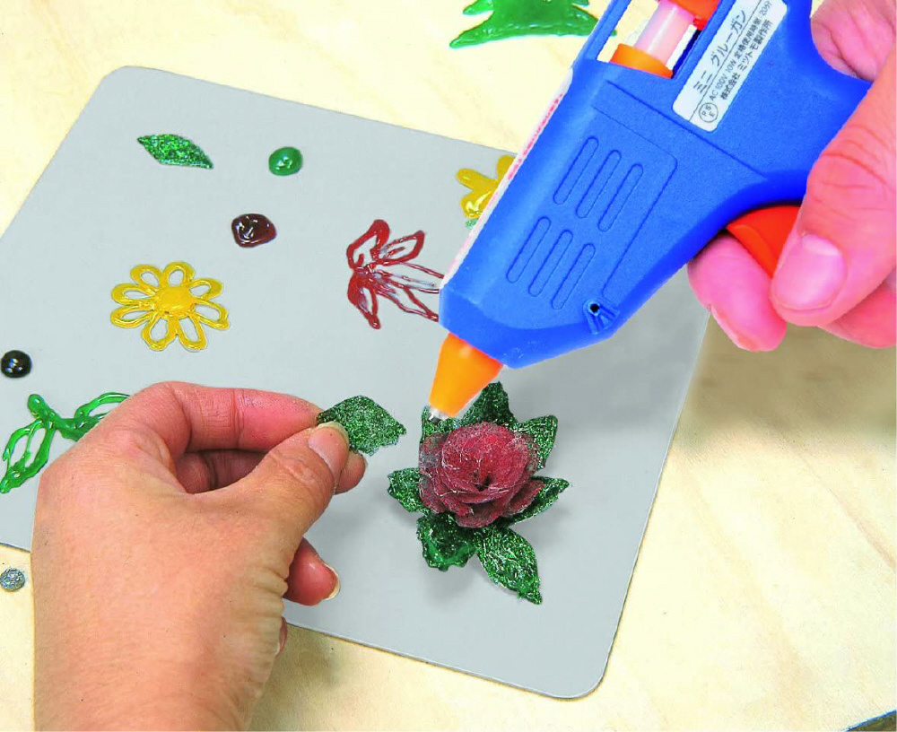 木、紙、革、布などの接着に!。ガラス、プラスチック、タイル、陶器、石、金属などの仮止めに!。ぬいぐるみ、木製品の修理、製作、本の修繕に!。スイーツデコ、アートフラワー、模型の製作に!。電線、電子部品の仮止め、コンクリートのすき間埋めや防水に!。使い易くおうとつ面もO.K!。