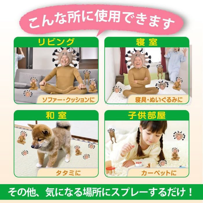 ●布団やタタミ、カーペットやソファーなどにシュッとスプレーするだけ。ダニをよせつけにくくして、元から減らしていきます。