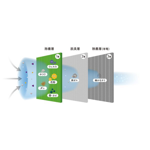 緑色の層に抗ウィルス剤を採用し、フィルターに付着したウィルスの繁殖を抑制します。