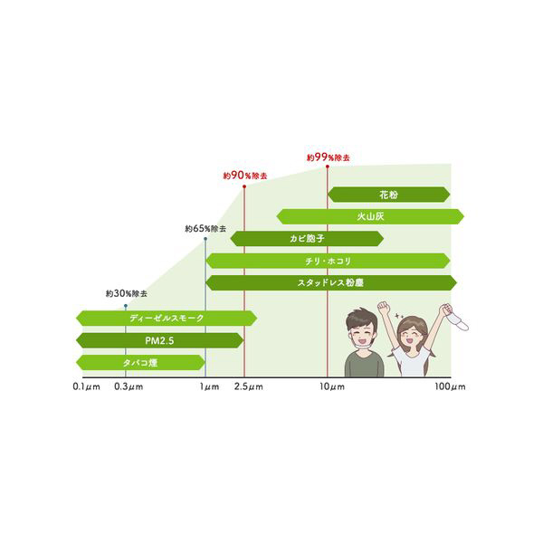 ※0.1μm=1mmの70万分の1の大きさ(例:髪の毛=約70μm)※粒子径により、ろ過効率は異なります。