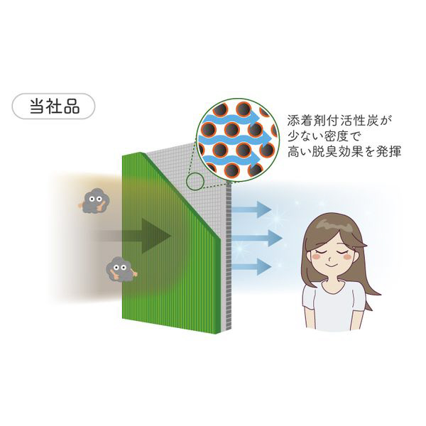 デンソークリーンエアフィルターの添着剤付活性炭は少ない密度でも高い脱臭効果を発揮し、高除塵・脱臭機能を実現しつつ、快適なエアコン風量を維持します。