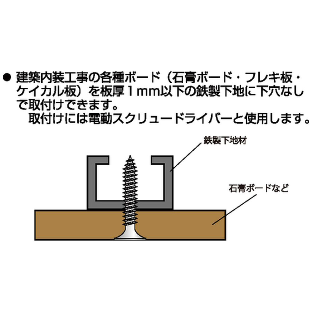 石膏ボード・フレキ板・ケイカル板などを鋼製下地(板厚保1mm以下)に下穴無しで取り付けできます。