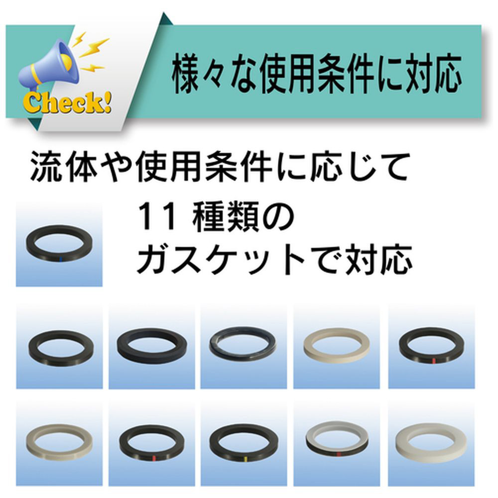 ■【様々な流体に対応】カムロックの材質は、アルミ合金・ステンレススチール・ポリプロピレン・ブロンズがあり、流体に応じて選定可能です。