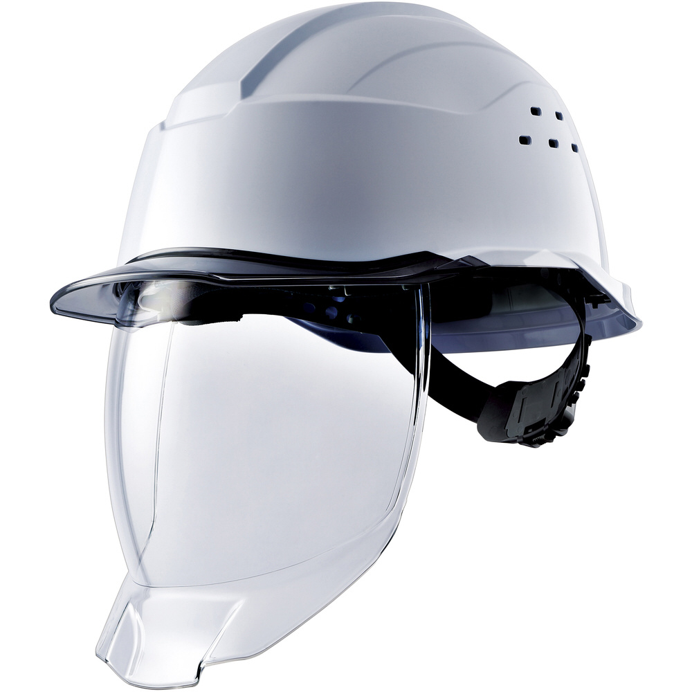 ■返し機構付フルフェイスシールド面は飛来物をはね返し、首回りへの飛散を防止します。