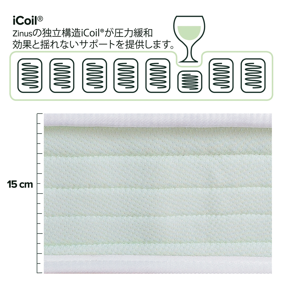 ZINUS独自の独立コイルiCoil(R)は通気性に優れた並行配列のポケットコイルです。シングルサイズには450個、セミダブルには570個、ダブルには660個のコイルを採用。