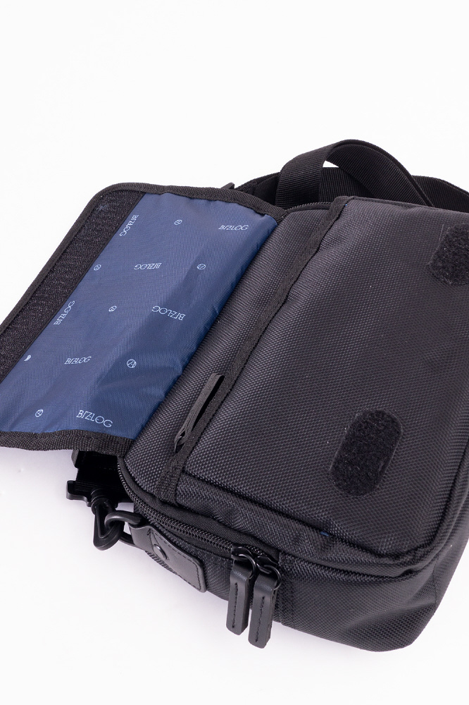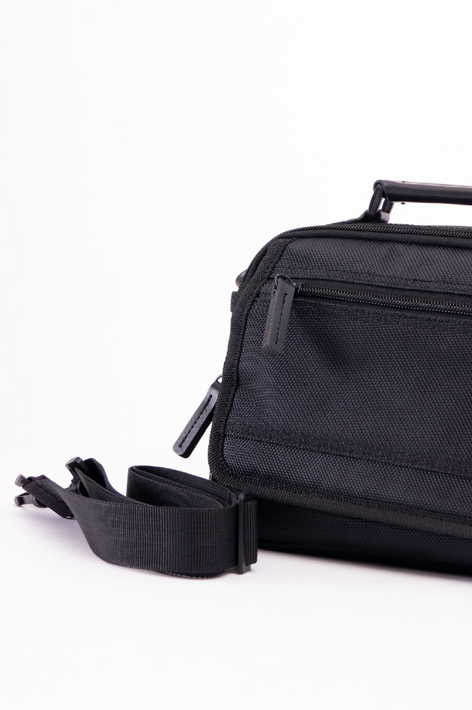ファスナーポケット×3、仕切り付属×1、着脱式ショルダーベルト付き