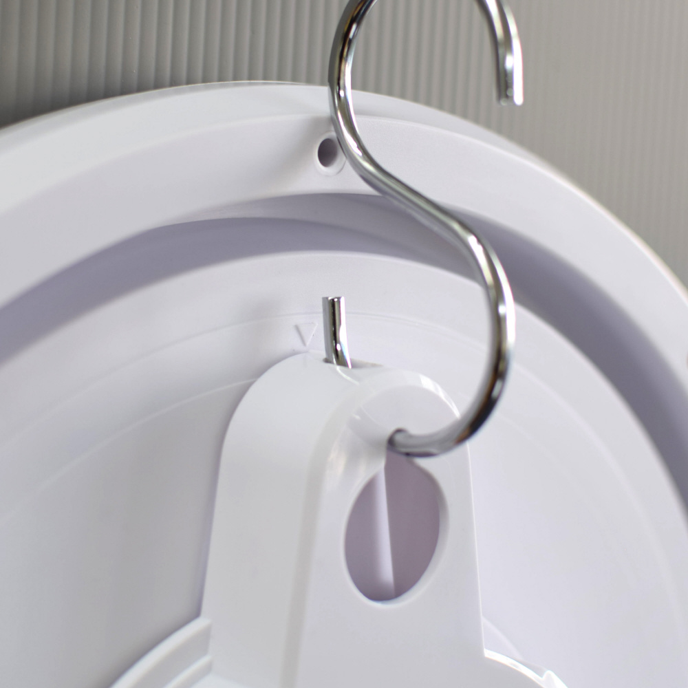 軽くて割れにくいアクリル前面カバー、掛穴はねじ以外にもS字フックも利用できる設計になっています