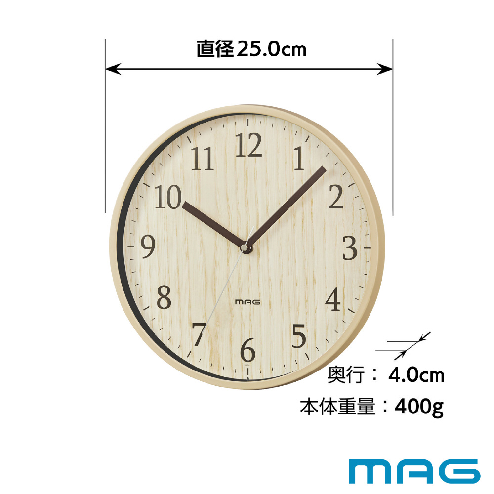 インテリアに合わせやすい木目調。 静かな寝室等にもお使いいただけるスムーズに動く秒針です。 直径約250mmの小さめサイズで設置場所を選びません。