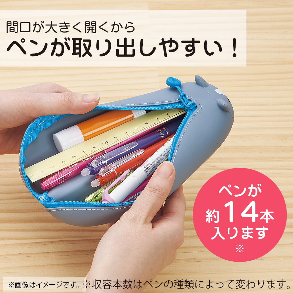 ペンが約14本入ります。ペンや文具小物入れに。底面は転がりにくいフラット仕様。
