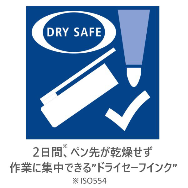 発色の良い独自のインクは、空気に触れるとペン先に薄い皮膜をつくり、キャップを閉め忘れても約2日間であればペン先の乾燥を防ぎます。(※ISO554 ネオンカラーの6色は除く)