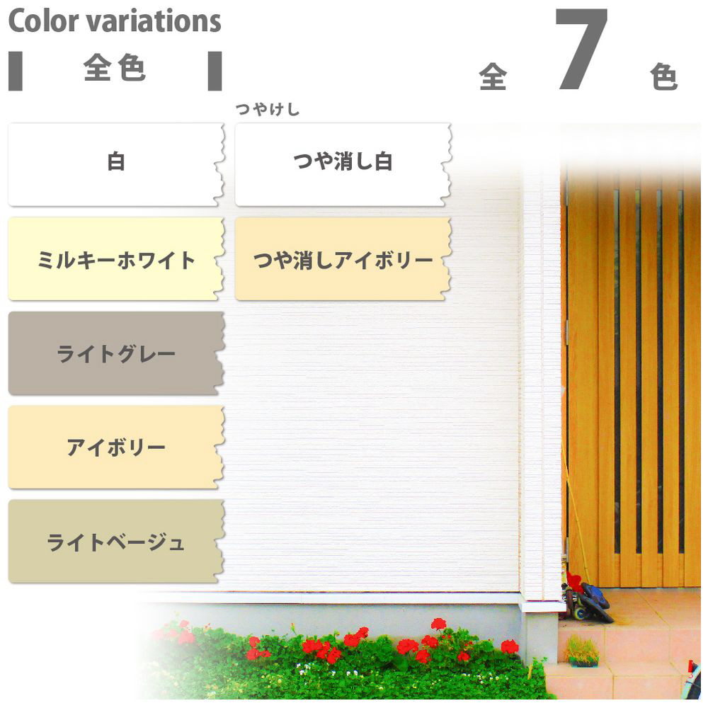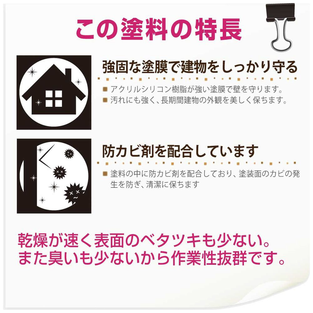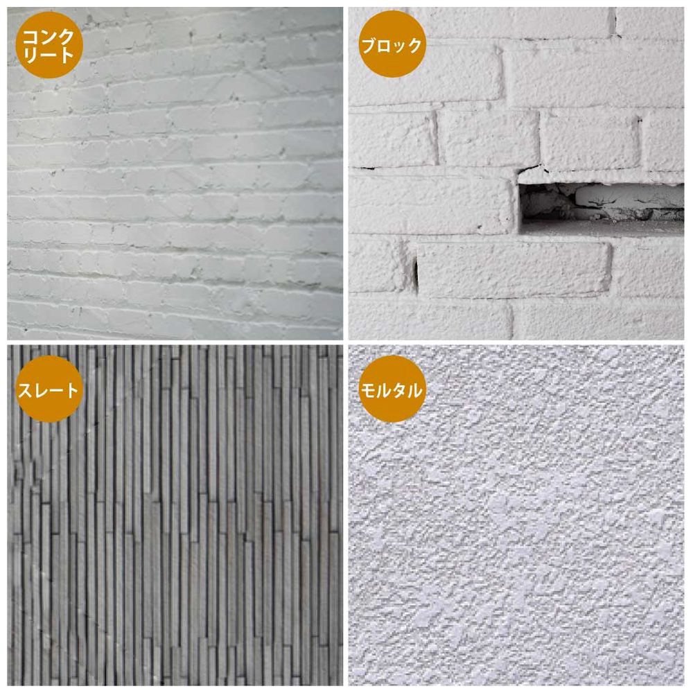 ●防カビ剤配合だからをカビの発生から守ります。【用途】コンクリート壁、ブロック塀、リシン壁、吹きつけ壁、サイディング【塗れないもの】セラミック系サイディング、タイル、セラミック、フッ素、シリコンなど特殊処理された壁、プール・池など常に水に浸かっている所