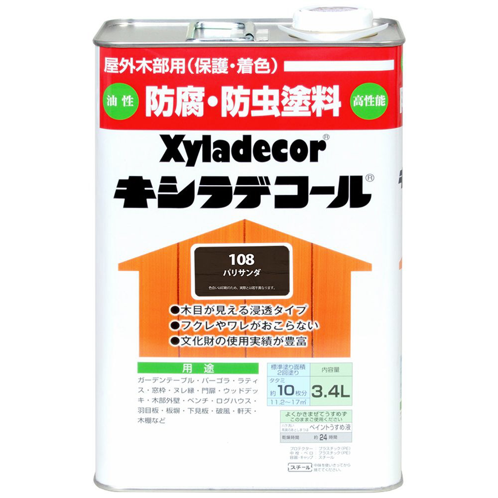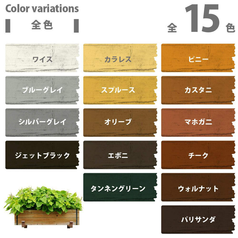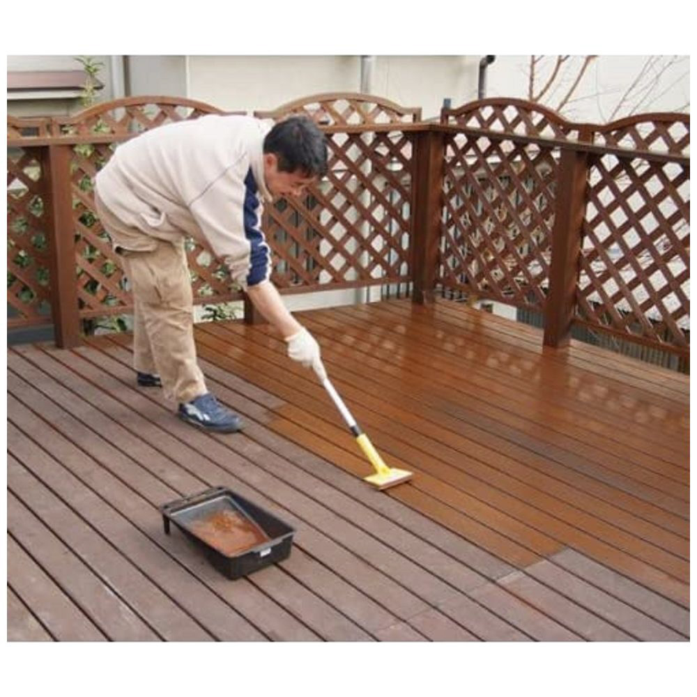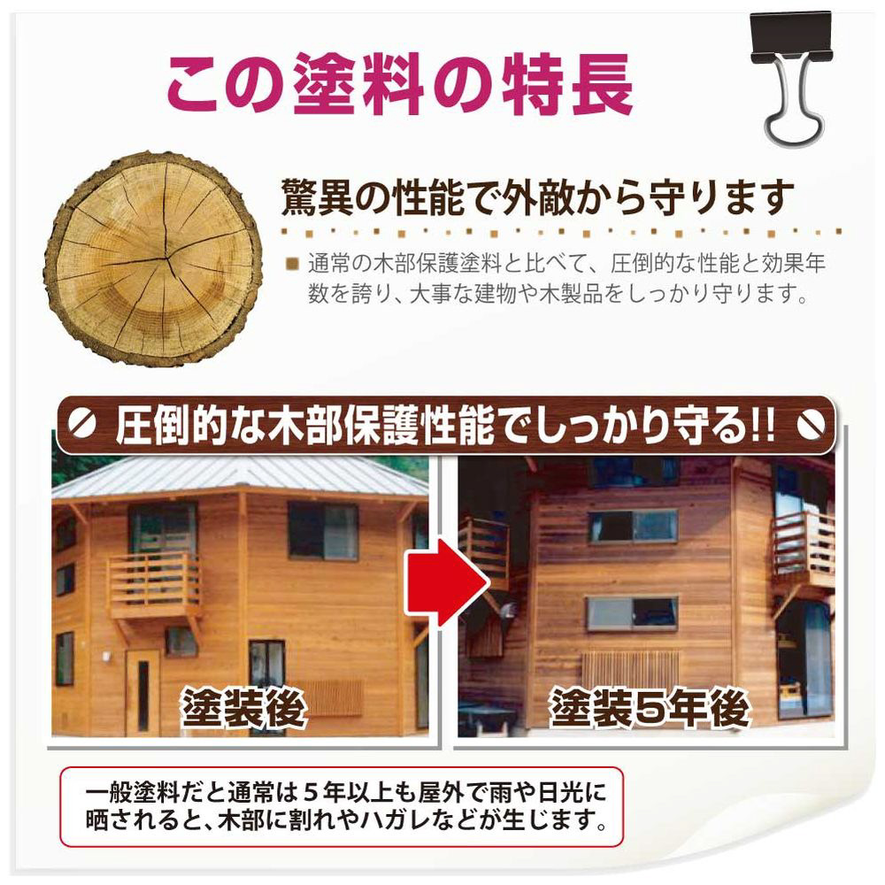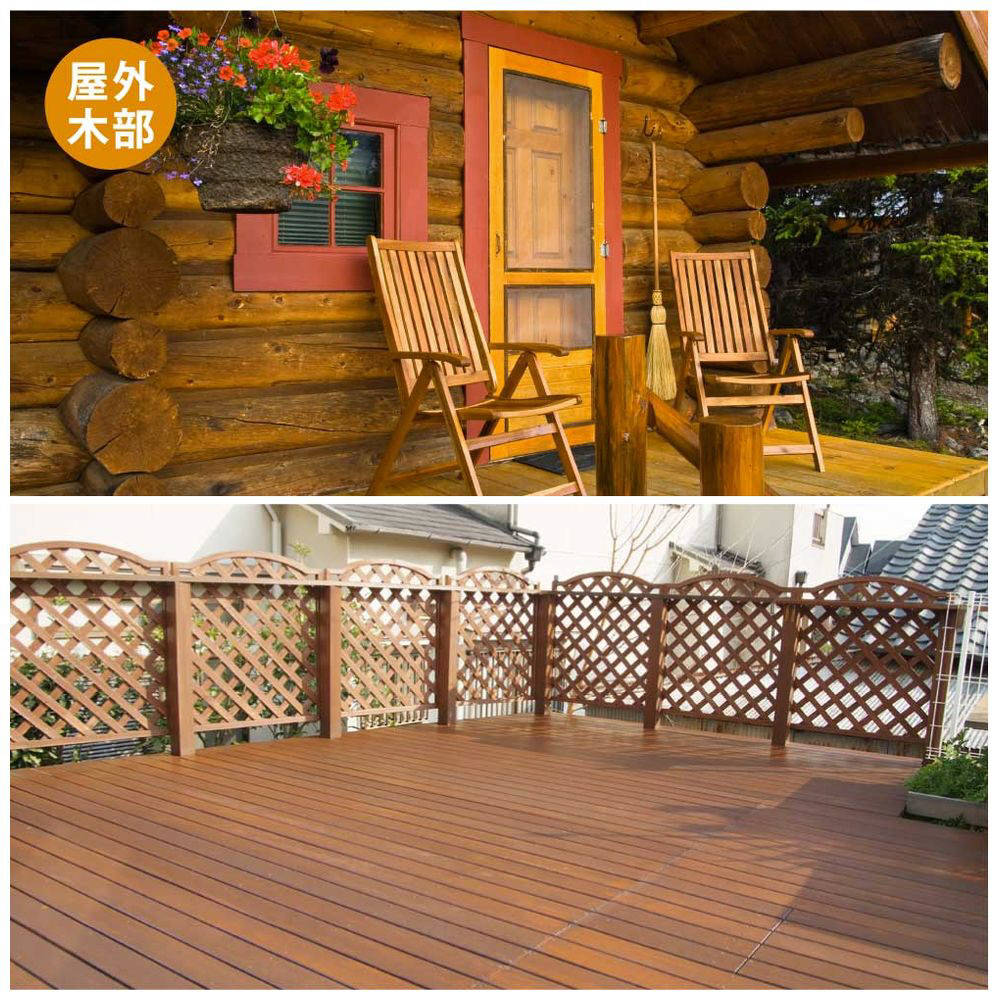 ●木目をいかしたまま表面に塗膜を作らず着色するので、木材の持つ自然な風合いを引き立たせます。【用途】屋外の木部(ウッドデッキ ラティス パーゴラ ベンチ ログハウス 羽目板 板へい)【塗れないもの】吸い込みのない木材(プリント合板・デコラ板)、常に水に浸かっている所、犬小屋・鳥小屋※塗装後も保護成分の臭いが若干残りますので、屋内木製品の塗装には不向きです。