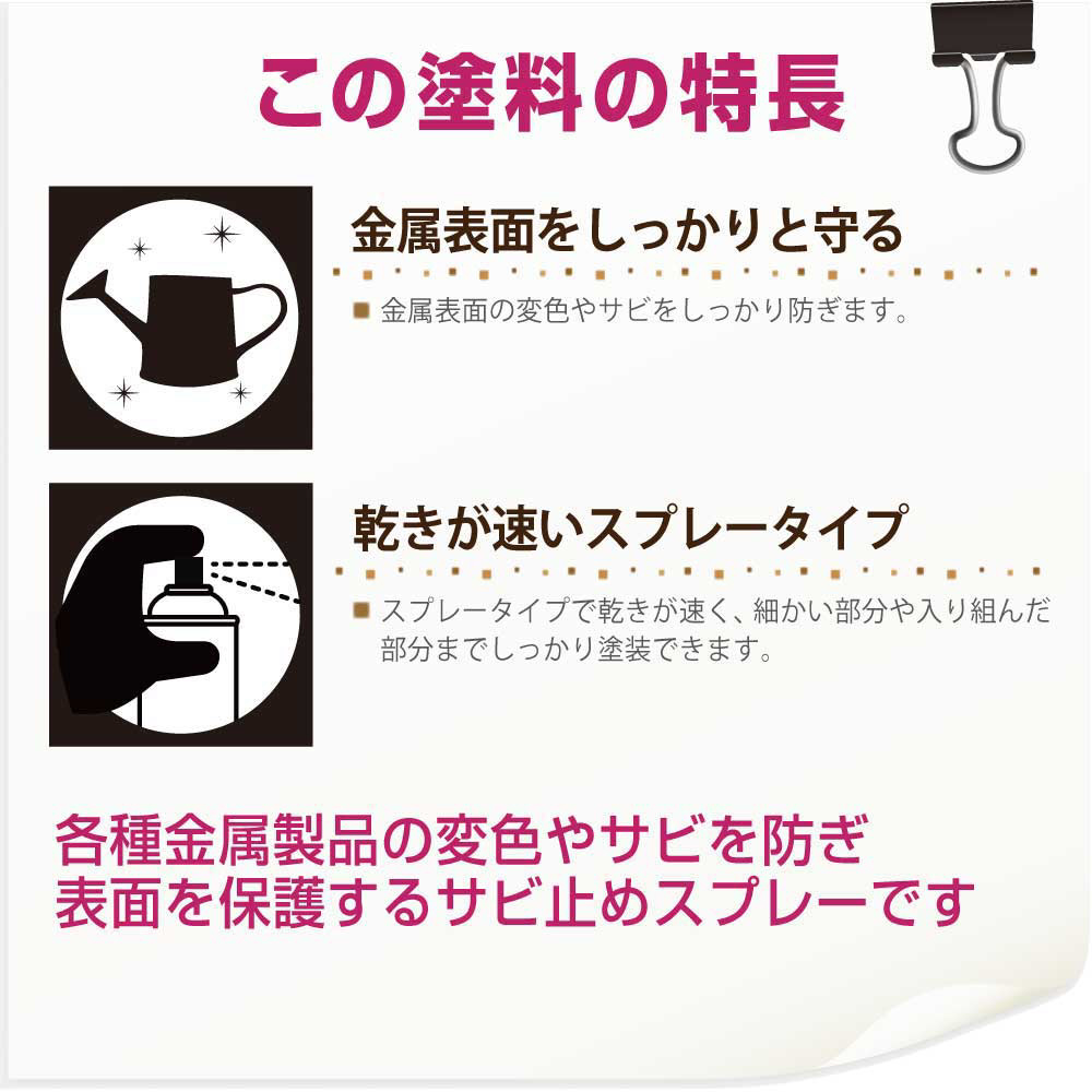 ●各種金属の表面を長時間保護し、変色やサビを防ぐ速乾タイプのつやあり透明さび止め剤です。【用途】メッキ・銅・真ちゅう・鉄・アルミ・銀などの各種金属製品のさび止め用下塗りに(自転車・バイク・門扉・ドア・サッシなど)【塗れないもの】食器類は使用できません。表示以外の用途には使用しないで下さい。