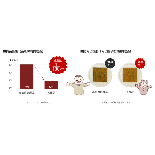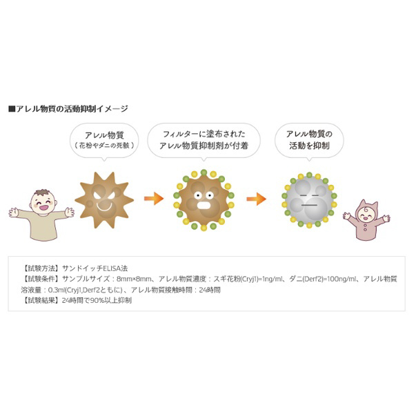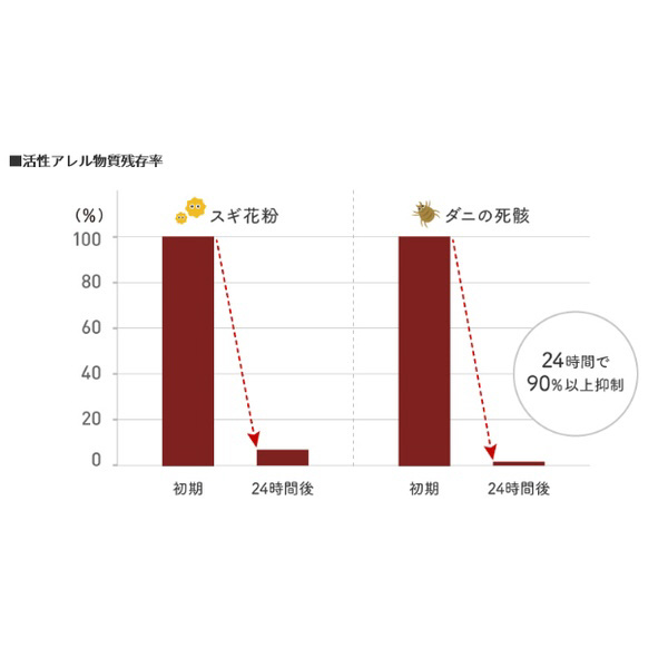 ●ダニや花粉などのアレル物質を90%以上抑制!黄色の層に塗布されたアレル物質抑制剤が、ダニの死がいや花粉などのアレル物質を24時間で90%以上抑制します。 アレル物質への抵抗力が弱い赤ちゃんでも快適・安心に過ごせる空間作りをサポートします。【試験方法】サンドイッチELISA法【試験条件】サンプルサイズ:8mm×8mm、アレル物質濃度:スギ花粉(Cryj1)=1ng/ml、ダニ(Derf2)=100ng/ml、アレル物質溶液量:0.3ml(Cryj1,Derf2ともに) 、アレル物質接触時間:24時間【試験結果】24時間で90%以上抑制