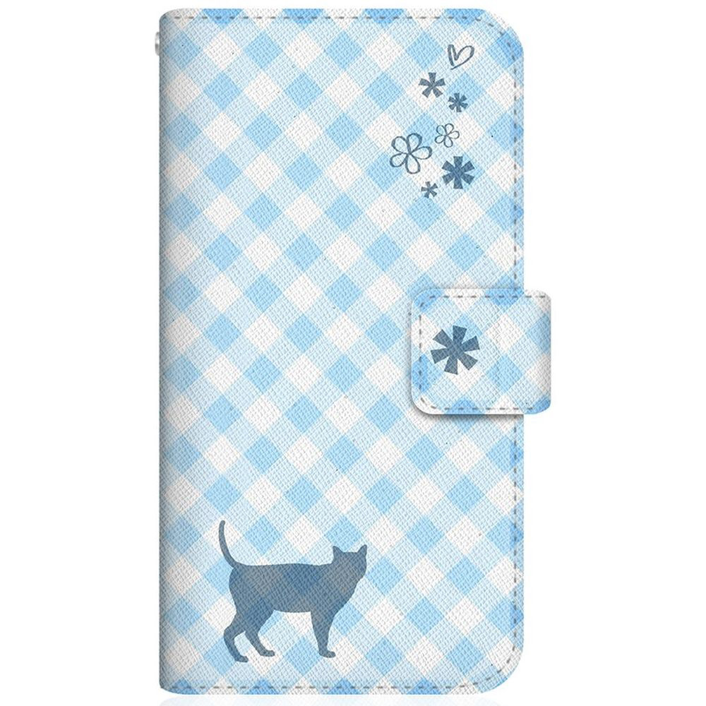 NYAGO 704SH スリム手帳型ケース NYAGO ノート サマー フラワー ダイアリー キャット シルエット - ブルー チェッククロス柄 & なんだにゃ? 704SH-BNG2S2671-78