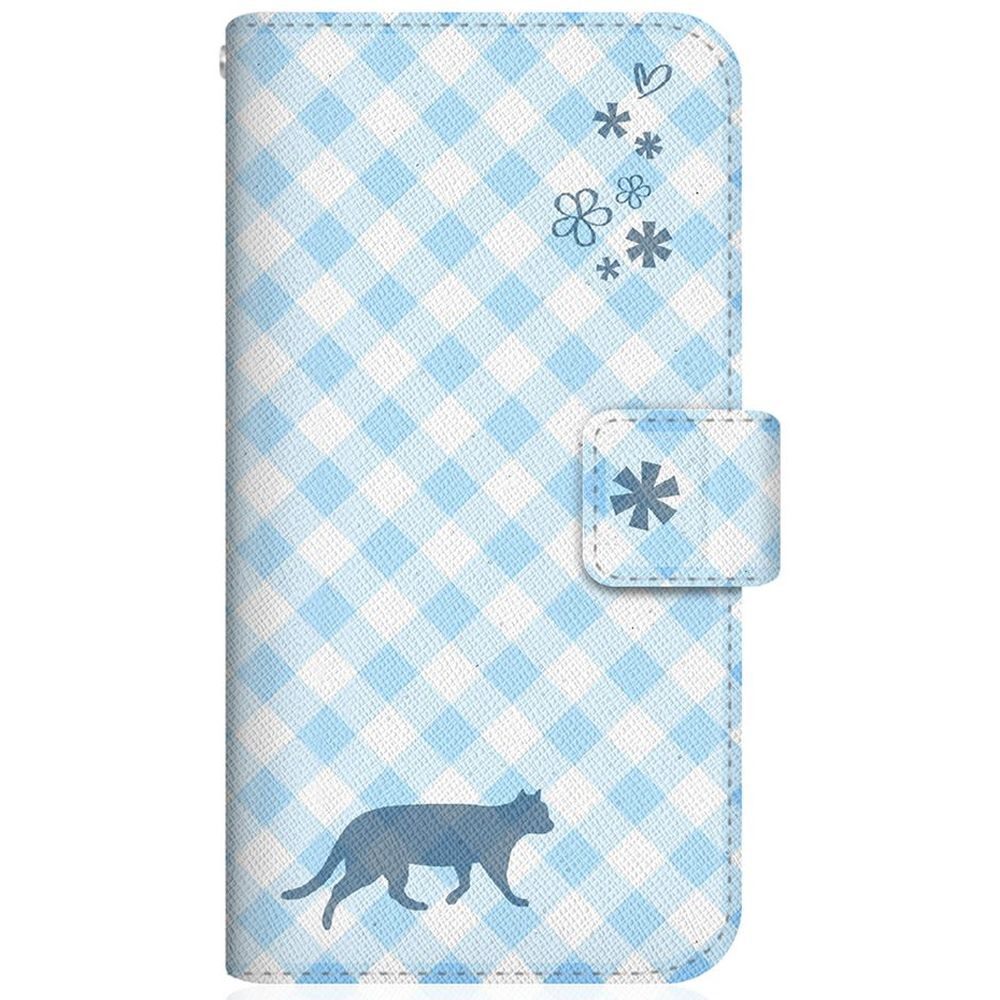 NYAGO 704SH スリム手帳型ケース NYAGO ノート サマー フラワー ダイアリー キャット シルエット - ブルー チェッククロス柄 & てくてくお散歩 704SH-BNG2S2675-78