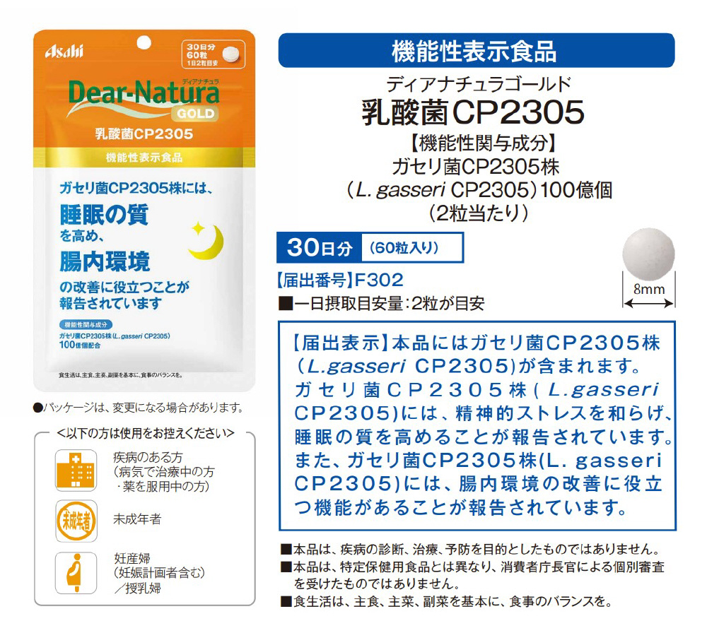 睡眠の質を高める機能・腸内環境の改善に役立つ機能が確認されているアサヒグループオリジナル素材「乳酸菌CP2305」。(機能性関与成分 ガセリ菌CP2305株(L.gasseri CP2305)100億個配合。