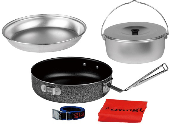 重量:620g 収納サイズ:Φ20.5×9.5cmフライパン(Φ20cm):アルミ製(ノンスティック加工済、ハンドル付き)ビリーコッヘル(1.0リットル):アルミ製(無垢)アルミプレート:アルミ製(無垢)付属:ストラップ、収納袋 1〜2人分の調理をするのに適したソースパンとフライパン、アルミベースプレート1枚がセットになったクッキングセットです。収納時は付属のストラップで固定し人数に応じて別売のアルミベースプレートを追加することも可能です