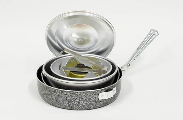 1〜2人分の調理をするのに適したソースパンとフライパン、アルミベースプレート1枚がセットになったクッキングセットです