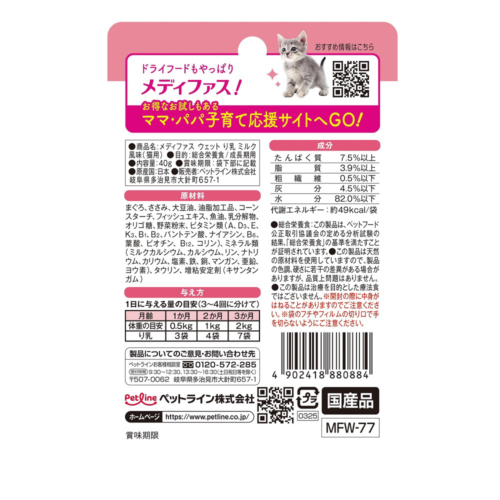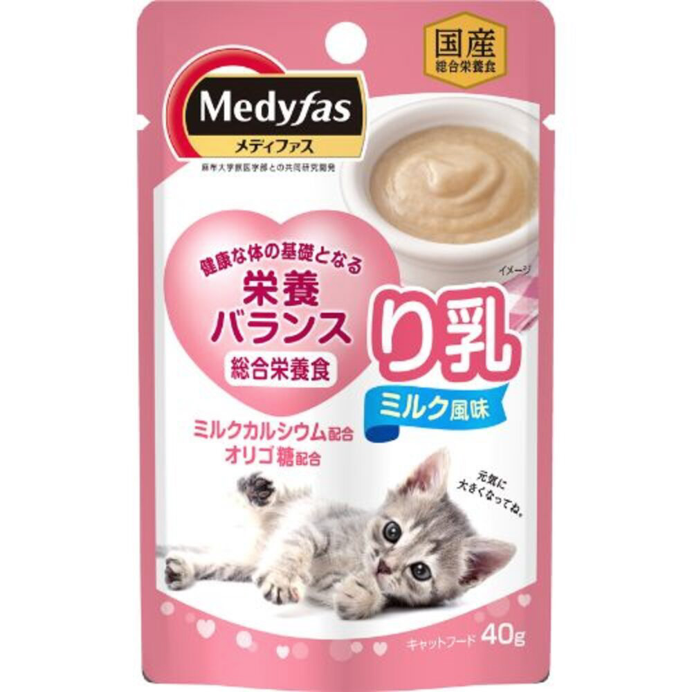 り乳期の子ねこに食べやすいペーストタイプ。発育盛りの子ねこに最適な栄養バランス。ミルクカルシウム配合。やさしいミルク風味。