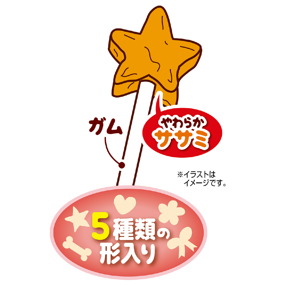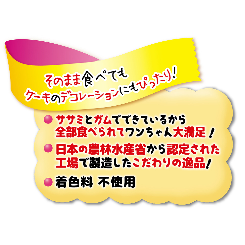 ササミとガムでできているから全部食べられてワンちゃん大満足!そのまま食べてもケーキのデコレーションにもぴったり!かわいい5種類の形入り。着色料不使用。