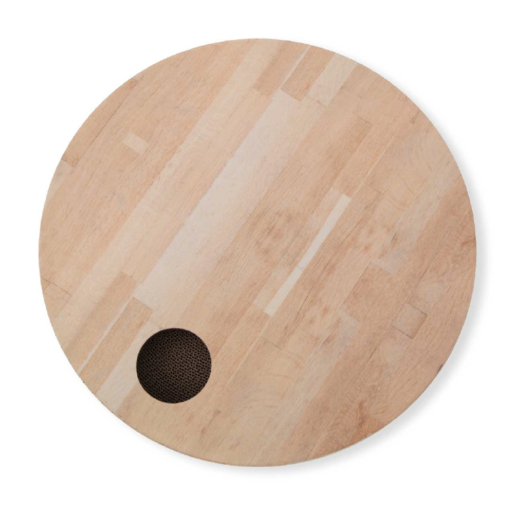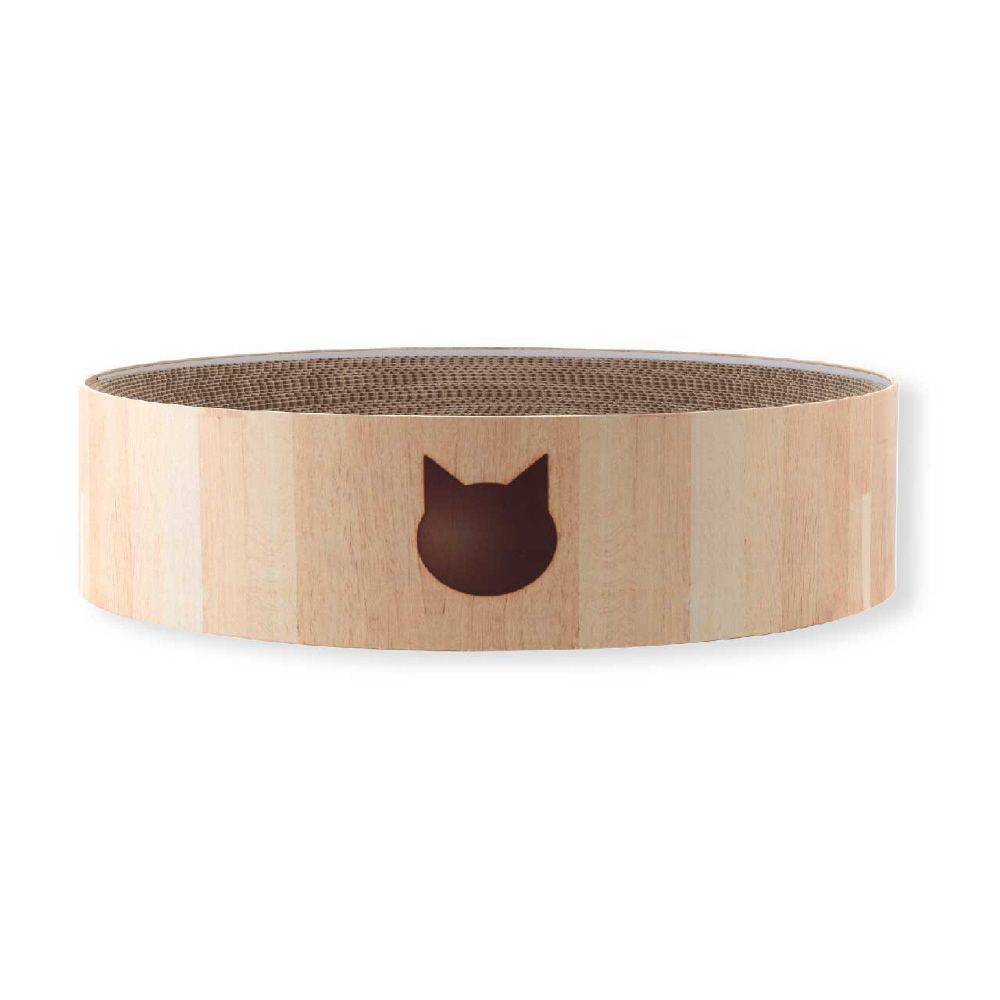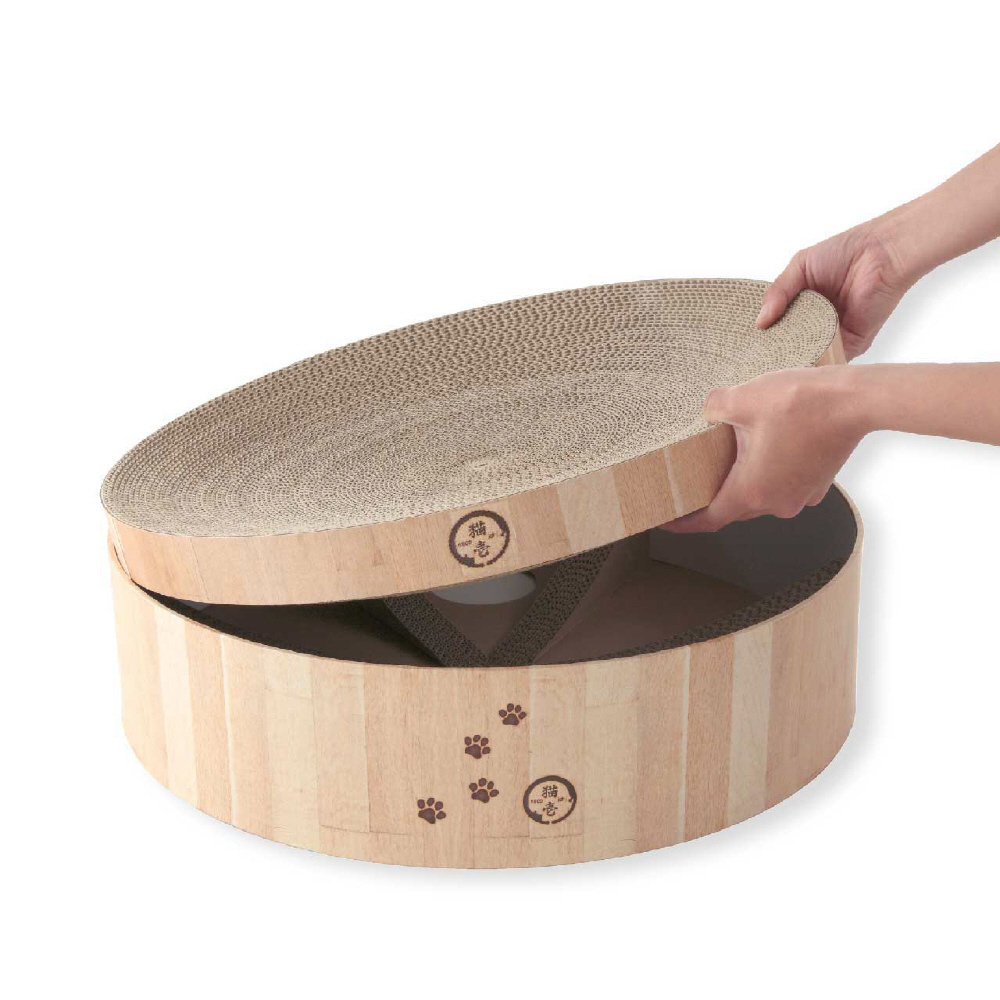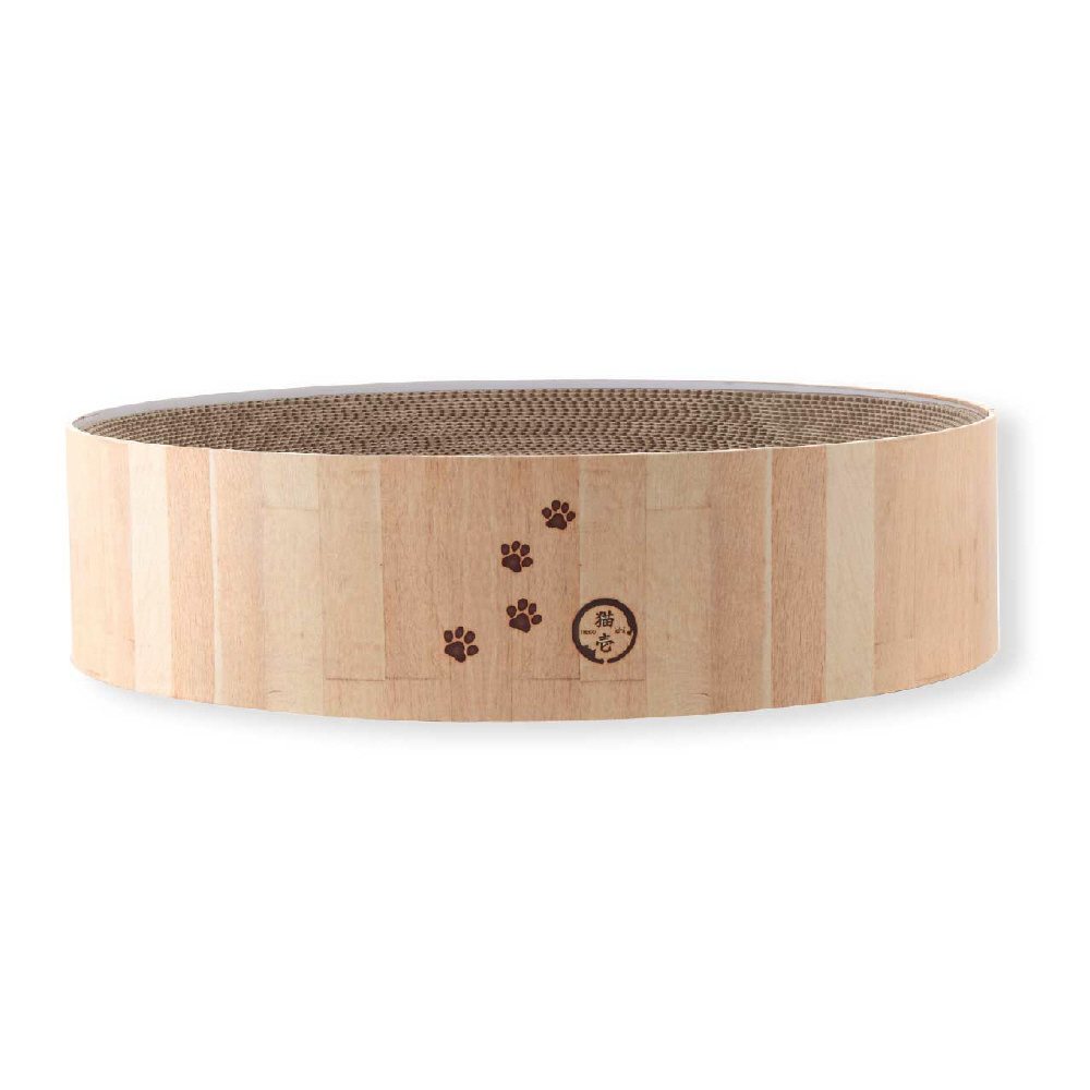 大型サイズだからこそお家のインテリアを邪魔しないシンプルな木目調デザインとなっています。焼印をイメージした、猫のフェイスマークと肉球の足跡模様で可愛さをプラスしました。