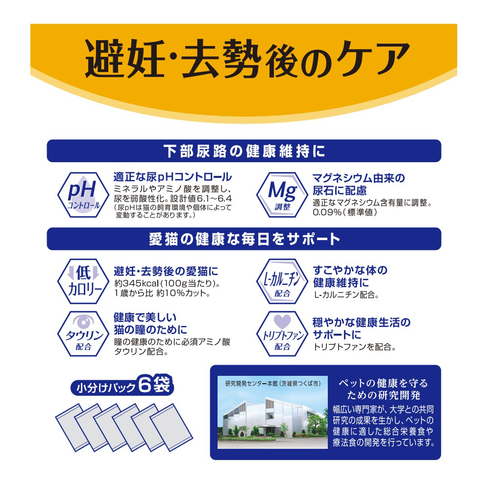 マグネシウム由来の結石に配慮。カロリー控えめ(1歳から比約10%カット)。子ねこから与えられる全ライフステージ用。尿pH設計値6.1〜6.4マグネシウム含有量0.09%(標準値)
