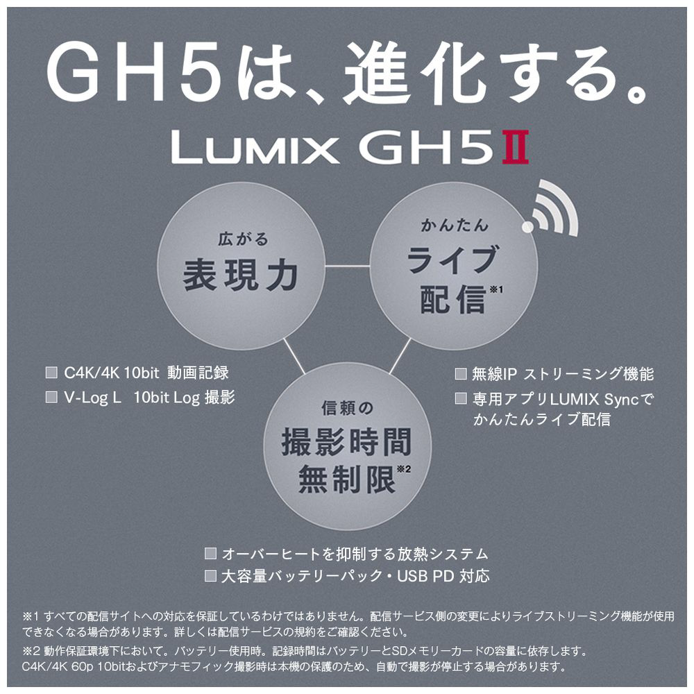 GHシリーズの系譜を継ぐプロフェッショナル動画性能と、5G対応端末などと連携し、無線ライブ配信※1を実現する「GH5 II」■5G対応端末などと連携して、手軽に高品位な無線ライブ配信ライブ配信※1に便利な専用アプリ LUMIX Syncを使ってスマートデバイスからかんたん操作※1:すべての配信サイトへの対応を保証しているわけではありません。配信サービス側の変更によりライブストリーミング機能が使用できなくなる場合があります。詳しくは配信サービスの規約をご確認ください。■クリエイターの表現の幅を広げる進化した基本性能高精細でリアルな解像力を実現する20.3M Live MOSセンサー&最新のヴィーナスエンジン搭載追従精度が向上したリアルタイム認識AF、6.5段※2の手ブレ補正システムDual I.S. 2を搭載オーバーヒートを抑制する放熱システムにより、収録やライブ配信で動画撮影時間無制限※3を実現※2:CIPA規格準拠。(Yaw/Pitch方向:焦点距離f=140mm(35mm判換算f=280mm)H-FS14140使用時。※3:動作保証環境下において。バッテリー使用時。記録時間はバッテリーとSDメモリーカードの容量に依存します。C4K/4K 60p 10bitおよびアナモフィック撮影時は本機の保護のため、自動で撮影が停止する場合があります。■プロフェッショナルユースに応える動画撮影性能Cinema4K 60p 10bit、高解像アナモフィックモード(6K-A)記録などの多彩な動画記録モードスローモーションやクイックモーション撮影が可能なVFR(バリアブルフレームレート)自由度の高いカラーグレーディングを実現する10bitのV-Log L■充実の機能約12コマ/秒連写※4 (AFS設定時)シネライクD2/V2、L.クラシックネオ、L.モノクロームS4Kアナモフィック(4:3)モード動画記録中赤枠表示/ライブ配信中青枠表示ダブルSDカードスロットUSB3.1 Type-C 給電/充電(Power Delivery対応)防塵・防滴仕様※5、マイナス10℃耐低温設計※6※4:連写撮影速度は、使用レンズ、絞り、シャッター速度などの諸条件によって、低下することがあります。※5:当社製防塵・防滴対応レンズ装着時。防塵・防滴に配慮した構造になっていますが、ほこりや水滴の侵入を完全に防ぐものではありません。※6:当社製のマイナス10℃耐低温設計のレンズ装着時。【付属キットレンズ】LUMIX G VARIO 12-60mm/F3.5-5.6 ASPH./POWER O.I.S.(H-FS12060)