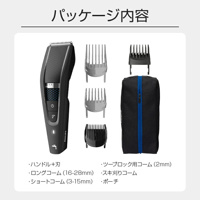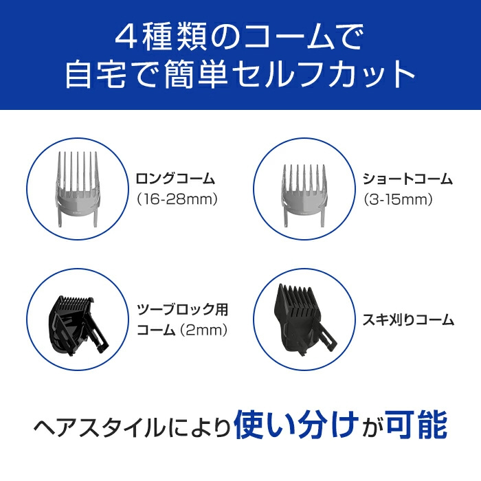 付属品 取扱説明書、グローバル保証書、充電アダプタ、ツーブロック用コーム(2o)、ショートコーム(3−15o)、ロングコーム(16−28o)、スキ刈りコーム、クリーニングブラシ、ポーチ