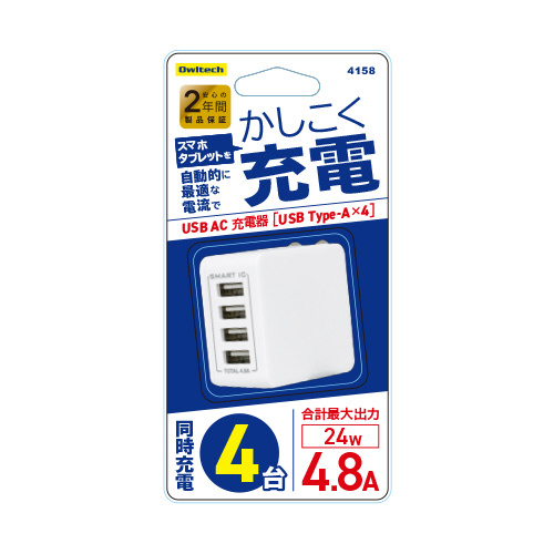 AC充電器 4台のデバイスをかしこく同時充電 お手軽&急速充電 ホワイト OWL-ACU448AS-WH [4ポート]