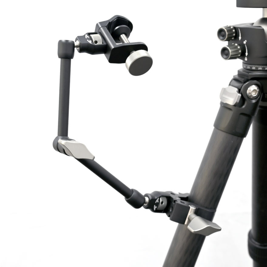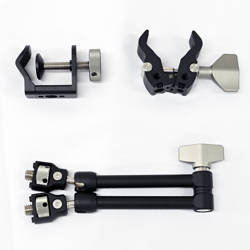 クランプとマジックアームの組み合わせ、三脚に傘を取り付けられる便利なセット。ネジ接続が空転しない構造でより安定した傘の固定が可能になりました。傘ホルダーとしてだけでなくもちろんアームなど個別に撮影に活用する事も可能です。