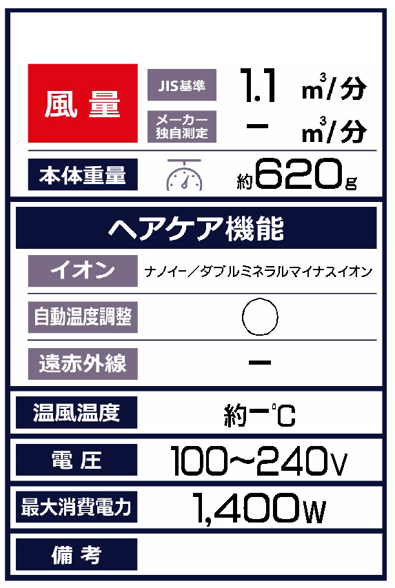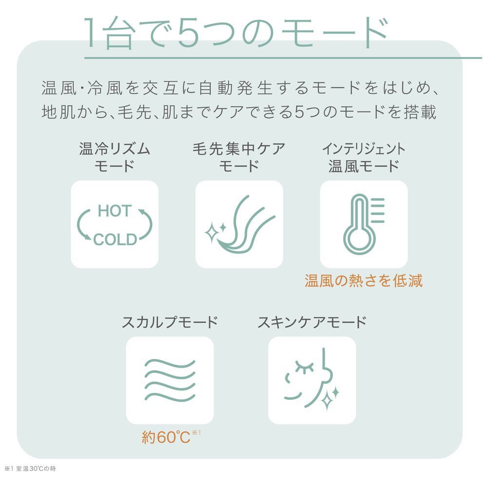 温風温度 約100 ℃(AC100/200 V・DRY/HOT時)約125 ℃(AC120/240 V・DRY/HOT時)(スカルプモード時 約60 ℃(AC100/200 V))
