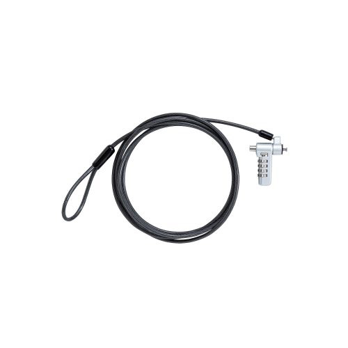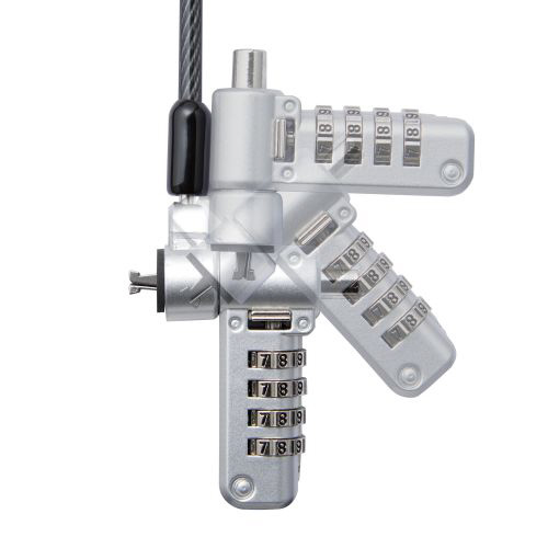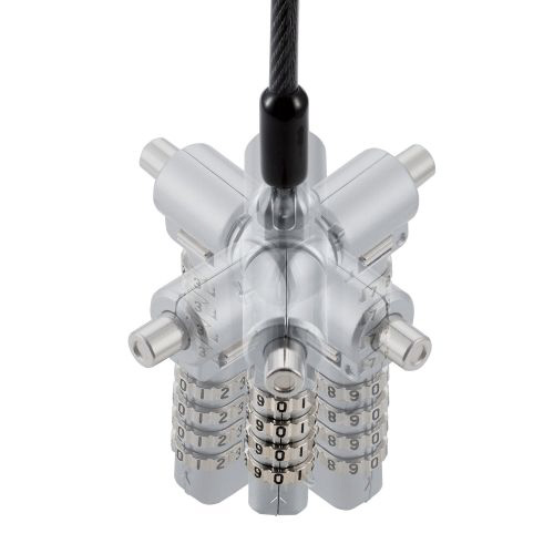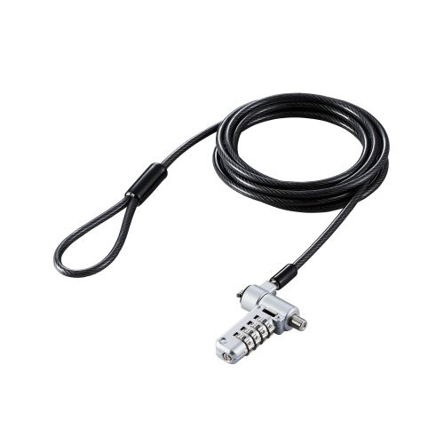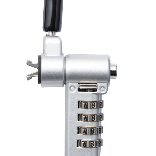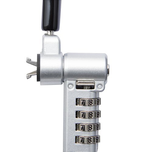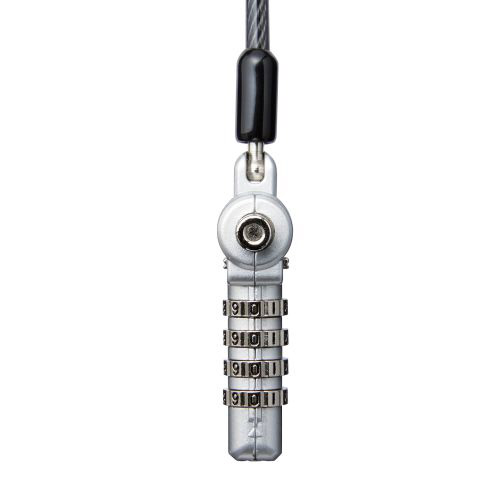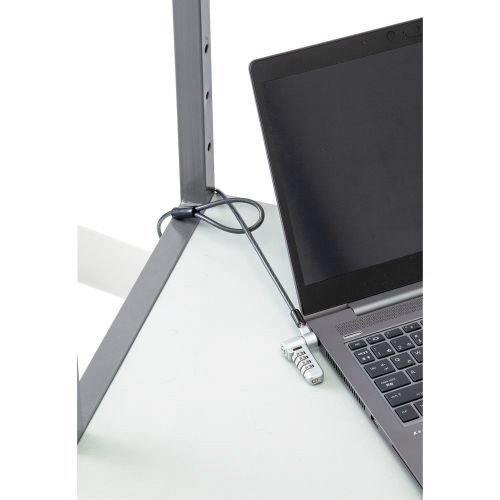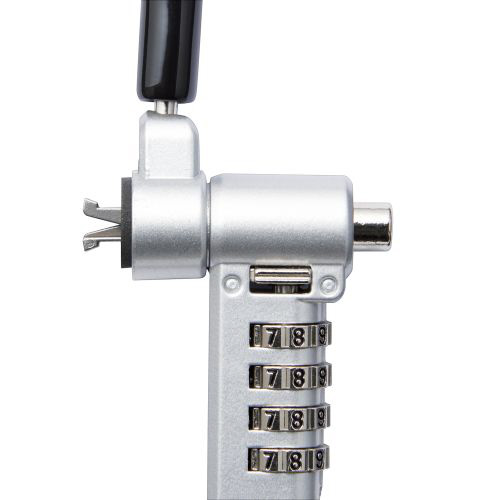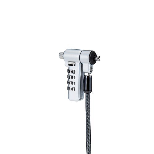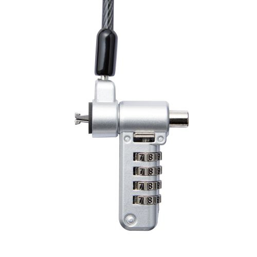 キー不要の4桁ダイヤルシリンダー錠。薄型ノートパソコン・液晶モニタ・タブレットなどを盗難から守るマルチスロット対応のセキュリティワイヤーロック。