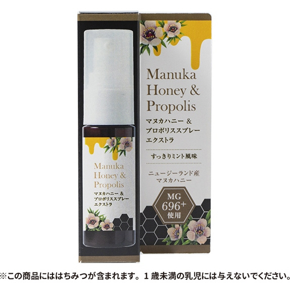 マヌカハニーMG696+(UMF18+相当)を使用し、従来品よりもプロポリス配合量を5%増量した、。高MGグレードのマヌカハニ―配合のマヌカハニー&プロポリススプレーです。