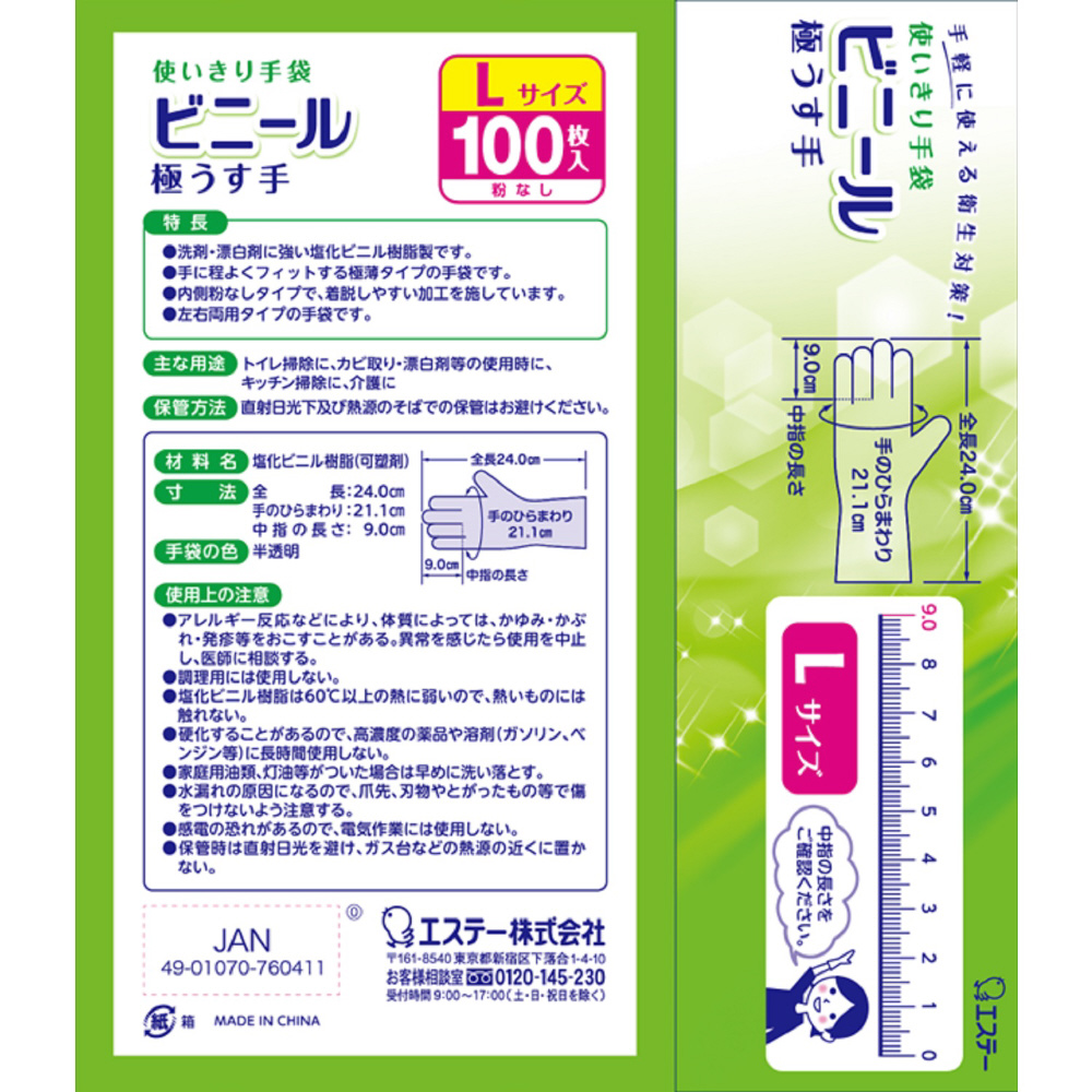 使いきり手袋 ビニール 極うす手 掃除用 Lサイズ 半透明 100枚 [粉なし 使い捨て手袋 左右両用タイプ トイレ掃除 カビ取り 漂白剤の使用時 キッチン掃除 介護 使い捨て] 半透明