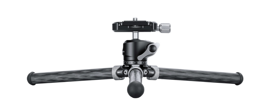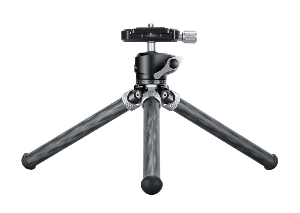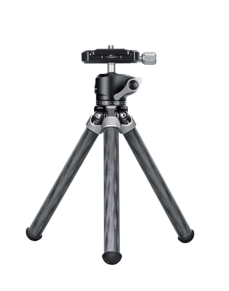 ミニ三脚ながら10層カーボンパイプを採用し耐荷重を犠牲にせず、軽量・小型化を実現。カーボンパイプに塗膜を施すことで、キズや摩耗を防ぎ、耐久性を向上します。三脚の付け根に開脚角度の調整機構を搭載。撮影条件に合わせてワンタッチで開脚角度を調整し、ローポジション撮影に対応します。