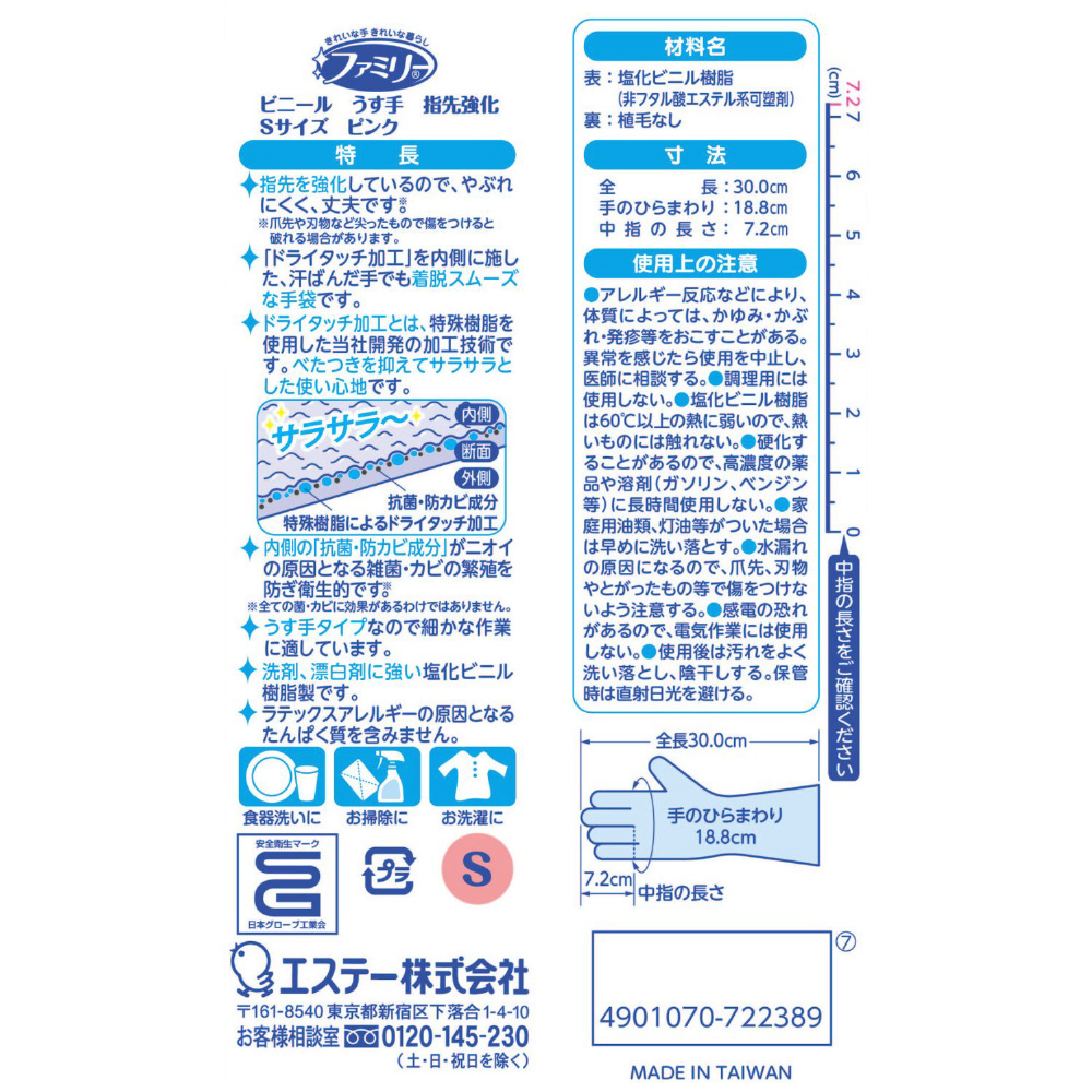 ファミリー ビニールうす手 指先強化 Sサイズ ピンク 1双 [家庭用手袋 指先強化でやぶれにくい ビニール手袋] ピンク ST72238