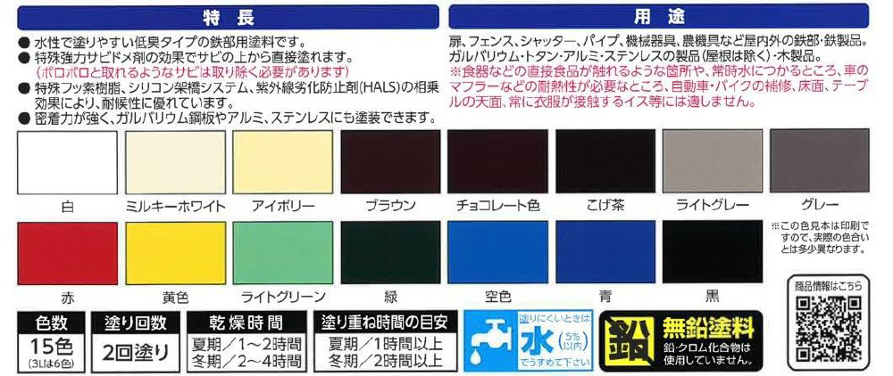 ●【適した場所】:扉、フェンス、シャッター、パイプ、機械器具、農機具など屋内外の鉄部・鉄製品。/ガルバリウム・トタン・アルミ・ステンレスの製品(屋根は除く)・木製品。※食器などの直接食品が触れるような箇所や、常時水につかるところ、車のマフラーなどの耐熱性が必要なところ、自動車・バイクの補修、床面、テーブルの天面、常に衣服が接触するイス等には適しません。