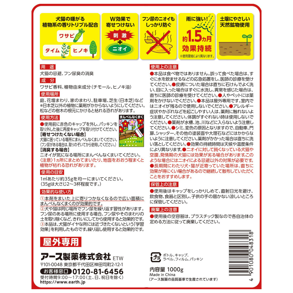 イヌ・ネコの嫌がる刺激(ワサビ成分配合)とニオイでフン尿被害や侵入を防ぐ粒状タイプの忌避剤
