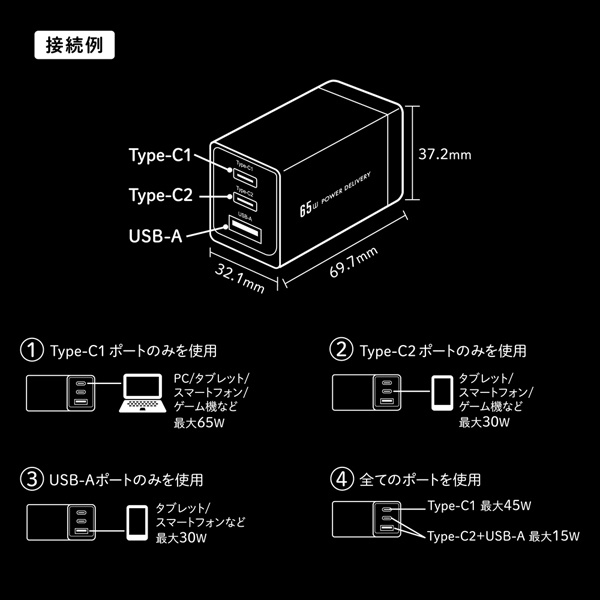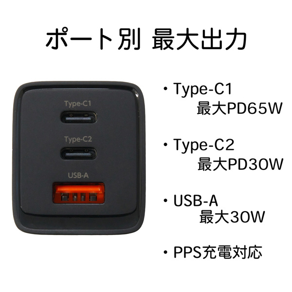 ■PD(PowerDelivery)充電、PPS(ProgrammablePowerSupply)充電に対応しております。※PPS充電とはPPSに対応した端末が発行する細かな充電電圧、充電電流の変更要求に対して段階的に充電電圧と充電電流を変化させる充電方式です。■Type-C1のみを使用した場合はPD最大65Wで充電致します。(1.5V/3A、9V/3A、12V/3A、15V/3A、20V/3.25A、PPS出力:3.3V-21V/3A)■Type-C2のみを使用した場合はPD最大30Wで充電致します。(2.5V/3A、9V/3A、12V/2.5A、15V/2A、20V/1.5A、PPS出力:3.3V-11V/3A、3.3V-16V/2A)■USB-Aのみを使用した場合は最大30Wで充電します。(4.5V/5A、5V/4.5A、9V/3A、12V/2.5A、20V/1.5A)■3台同時充電した場合はType-C1はPD最大45Wで充電しType-C2、USB-Aは合計最大15Wで充電します。(Type-C1:5V/3A、9V/3A、12V/3A、20V/2.25A、PPS出力:3.3V-16V/3A Type-C2:2.5V/3A ■Type-C1、Type-C2を同時充電した場合はType-C1はPD最大45Wで充電しType-C2はPD最大18Wで充電します。(Type-C1:5V/3A、9V/3A、12V/3A、20V/2.25A、PPS出力:3.3V-16V/3A Type-C2:2.5V/3A、9V/2A、12V/1.5A、15V/1.2A、20V/0.9A、PPS出力:3.3V-5.9V/3A、3.3V-11V/2A)USB-A: 5V/2.4A)■Type-C1、USB-Aを同時充電した場合はType-C1はPD最大45Wで充電しUSB-Aは最大18Wで充電します。(Type-C1:5V/3A、9V/3A、12V/3A、20V/2.25A、PPS出力:3.3V-16V/3A USB-A:5V/3A、9V/2A、12V/1.5A)■Type-C2、USB-Aを同時充電した場合はType-C2、USB-Aは合計最大15Wで充電します。(Type-C2:2.5V/3A USB-A: 5V/2.4A)※ノートパソコンで使用する場合、ノートパソコンの入力電圧および入力電流が使用範囲内であるか、ノートパソコンの仕様書をよくお読みの上ご使用下さい。また高出力の給電には、接続機器の出力に対応したケーブルをご使用ください。
