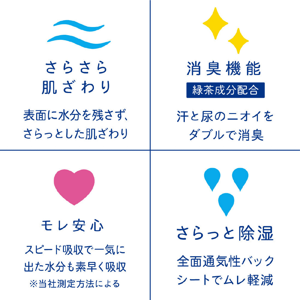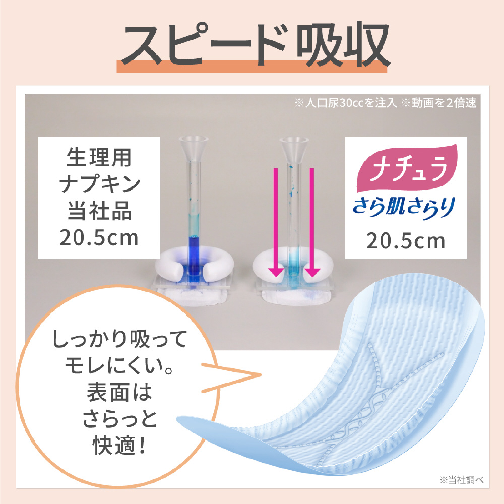 スピード吸収で一気に出た水分も素早く吸収。モレ安心。※メーカー測定方法による